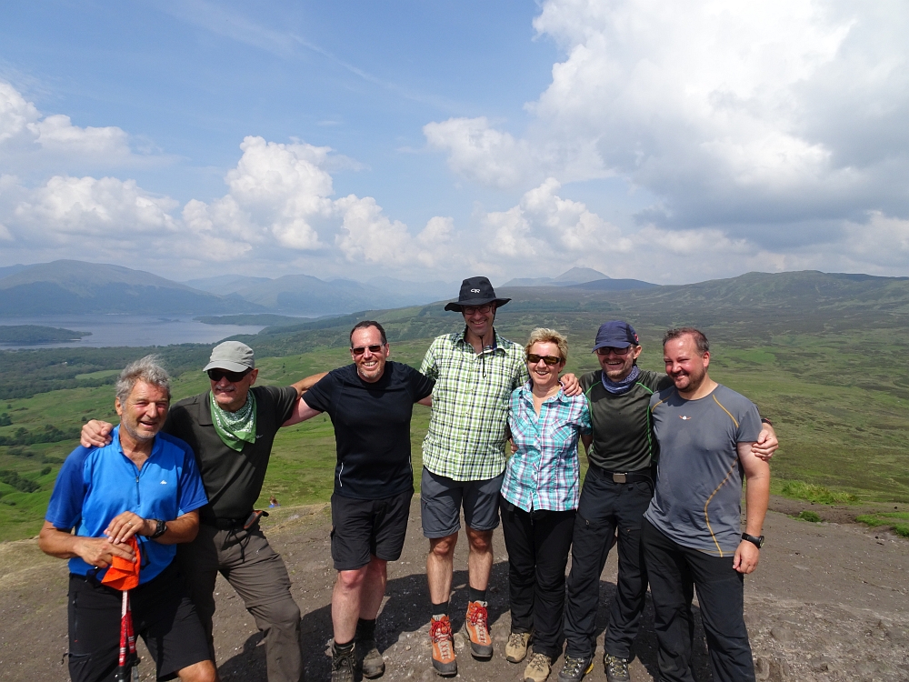 Ein Teil der Gruppe will es sich natürlich nicht nehmen lassen, am nächsten Tag, den höchsten Berg Großbritanniens, den Ben Nevis (1344 m), zu besteigen. Das Wetter verspricht gut zu werden und eine Besteigung möglich zu machen. Der Aufstieg bereitet bei dem guten Wetter keine größeren technischen Schwierigkeiten, ist konditionell jedoch fordernd, da doch über 1300 hm zu bewältigen sind. Schade, dass an diesem Tag wohl noch mehrere Wanderer die Idee hatten den Ben Nevis zu besteigen, so zog eine regelrechte Karawane auf dem größtenteils mit Steinplatten ausgelegten Weg, zum Gipfel. Beim Erreichen des Gipfels kommen leider Wolken auf, so dass die Aussicht nur kurze Zeit genossen werden kann. Am Nachmittag besichtigen wir noch die Whisky-Destillerie Ben Nevis und lassen uns in die Geheimnisse des Whisky-Brennens einweihen. Die Tour klingt mit einem Zug durch das Nachtleben von Fort William, einem lebendigen Städtchen, aus. Morgen geht’s leider wieder nach Hause.