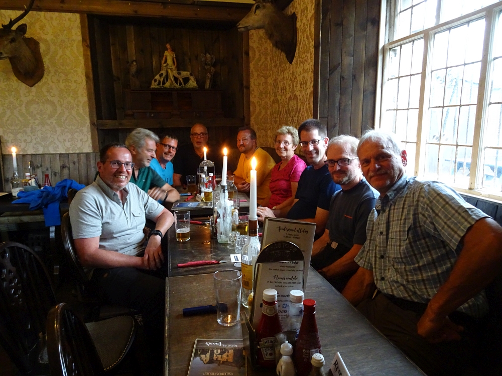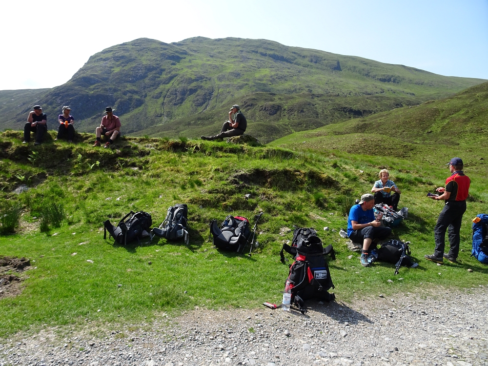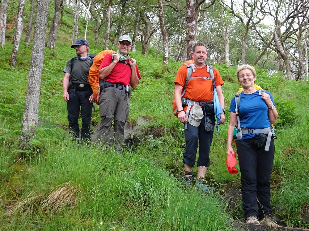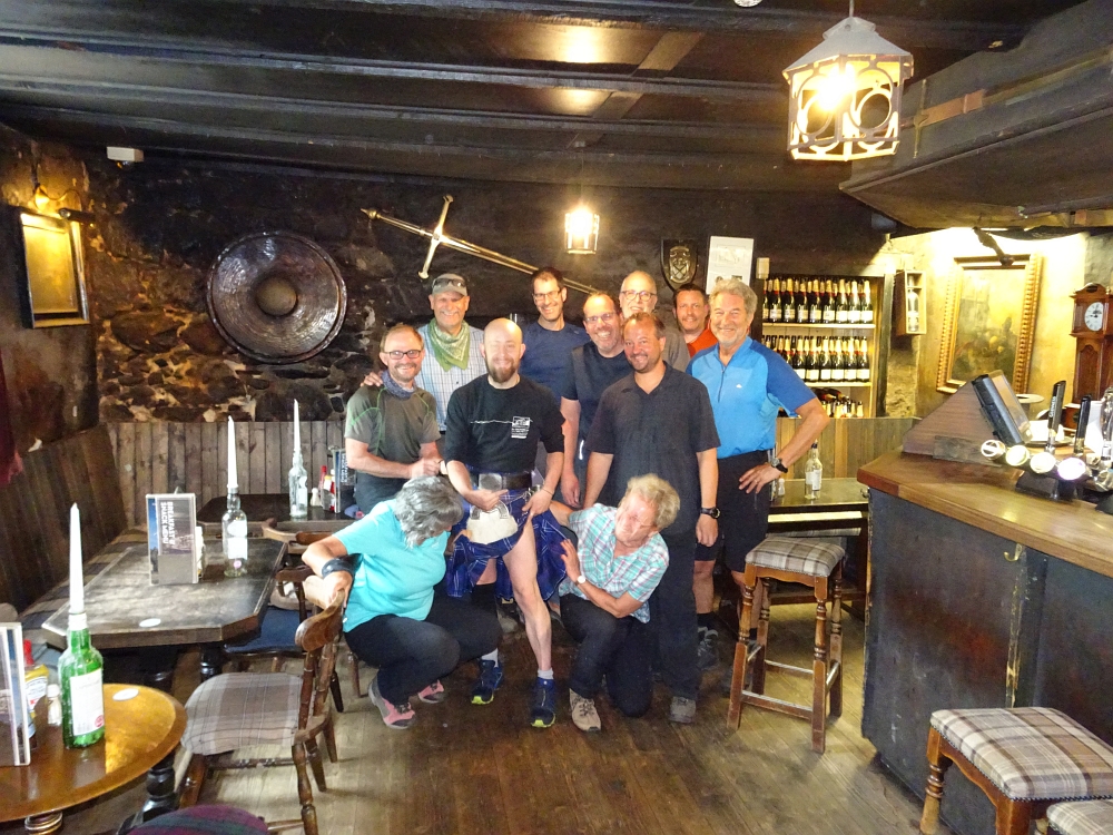 Heute ist eine Erholungsetappe angesagt. Ein gemütlicher breiter Weg führt uns größtenteils parallel zur Straße bzw. zur Bahnlinie verlaufend zu unserem Ziel dem West Highland Way Sleeper, einem ehemaligen Bahnhof, der zu einer Herberge umfunktioniert wurde. Während ein Teil der Gruppe den Nachmittag zum „Wunden lecken“ in der Herberge verbringt, lassen sich die Anderen nicht davon abhalten den 1074 m hohen „Beinn Dorain“ zu besteigen. Eine einfache aber anstrengende Bergwanderung, sind doch immerhin 900 hm zu bewältigen. Bei wunderschönem Wetter werden die Wanderer für ihre Mühen mit einer herrlichen Aussicht belohnt. Zum Abendessen erleben wir eine Überraschung, wie sie wohl noch auf keiner DAV-Tour vorgekommen ist. Die Unterkunft und insbesondere die Küche und der „Speisesaal“ machen eine „schmuddeligen“ Eindruck, was uns veranlasst uns zum Abendessen nach einer anderen Lokalität um zu sehen. Mangels Masse sind wir dann doch gezwungen im unserer Herberge zu essen. Kurzerhand stellen wir die Tische und Stühle nach draußen auf und funktionieren den Bahnsteig zum Restaurant um. Die Chefin des Hauses bekocht uns mit einem wirklich exzellenten indischen Diner, das wir so nie und nimmer erwartet hätten. Wir verbringen einen lustigen Abend, bei dem sämtliche Weinvorräte der Pension dran glauben müssen. (Typisch Pälzer halt!)
