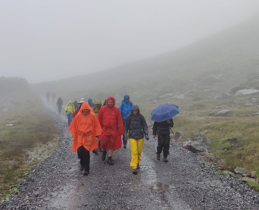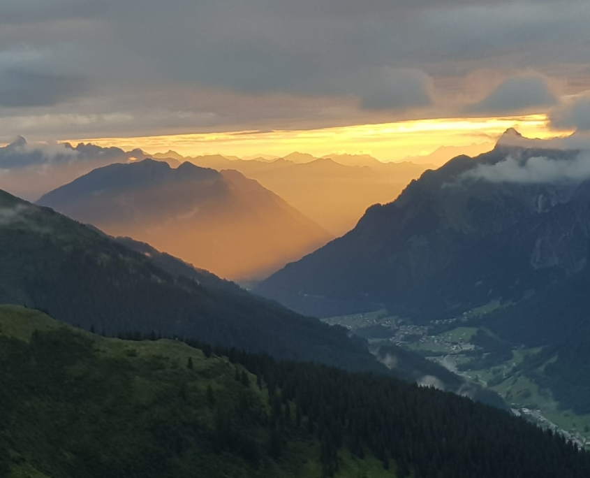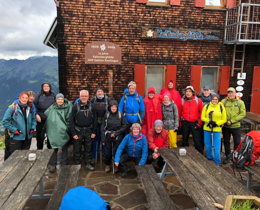 Samstag: Mit insgesamt 18 Personen (davon 10 Wiederholungstäter:innen) waren wir in der Frühe mit einem Karlsruher Stadtmobil und zwei Pkws gestartet und hatten kurz nach 10 Uhr den Arlberg-Pass erreicht, wo aufgrund des anhaltenden Regens die allgemeine Vermummung begann. Nachdem die Autos geparkt und die Fahrer zurück waren, ging es los Richtung Kaltenberg-Hütte (auf 2089m Höhe, auch ‚Reutlinger Hütte‘ genannt). Die Luft war dermaßen saturiert mit Niesel-Nebel-Regentropfen, dass zumindest ich persönlich an diesem ersten Tag keine Berge sah, nur schemenhafte Figuren in bunten Regen-Ponchos vor mir und ab und zu die Umrisse einer Kuh. Umso schöner war es, auf der Hütte anzukommen und einen gemütlichen Gastraum vorzufinden! Der Trockenraum hingegen ähnelte einer Tropfsteinhöhle, und konnte seine Funktion kaum erfüllen.