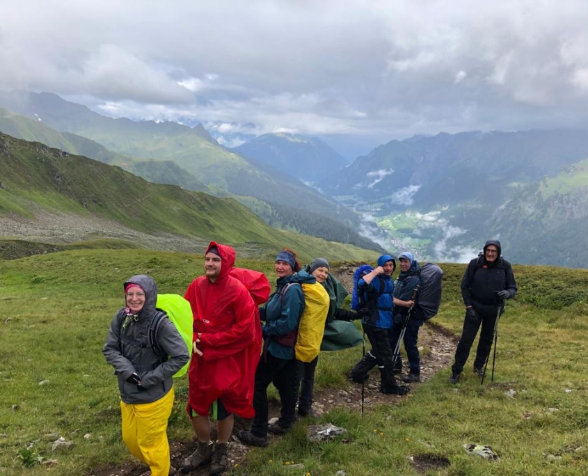 Mittwoch: Sollte jemand gehofft haben, trocken zum Ziel zu kommen – daraus wurde nichts. Auch der letzte Tag begann wieder mit Regen, der nur selten einmal nachließ oder kurzzeitig aussetzte, so wie beim Anstieg aufs Schafsbicheljoch (2636 m). Die Natur hatte ihre Aufnahmefähigkeit für all die Niederschläge der letzten Tage wohl erschöpft, Pfade wurden zu Rinnsalen und Spontan-Bergbächen. Die Hinterlassenschaften der Kühe taten das ihrige zum Glitschen bei. So eierten und schlitterten wir vom Joch zurück zur Konstanzer Hütte und von dort mit sichererem Tritt über die geschotterte Straße zur Bushaltestelle ‚Salzhütte‘. Mit dem kostenlosen Wander-Bus ging es nach St Anton, wo die Autos standen und es eine Gelegenheit zur Stärkung und zum Umziehen gab. Unsere Fahrer Erni, Markus, Oli und Nele brachten uns sicher und wohlbehalten nach Wörth zurück. Mir war Xenias Frage (bei nächtlichem Regengeprassel aufs Hüttendach über uns) im Ohr geblieben, zu der sie sich sogleich auch selbst die Antwort lieferte: „Warum tun wir uns das eigentlich an? – Um unsere Häuser und Wohnungen mit ihrem Komfort danach umso mehr schätzen zu können!“ Ich bin sicher, das taten wir alle am Abend. Diese zweite Verwall-Tour war auf jeden Fall ein Erlebnis, es entstand eine schöne Gemeinschaft, und vielleicht wird die Tour uns gerade wegen des Wetters noch besonders lange in Erinnerung bleiben. Vielen Dank an Steffi und Erni, die uns so kompetent vorbereitet und geführt und immer Mut zugesprochen haben!