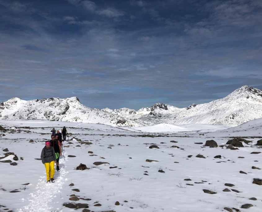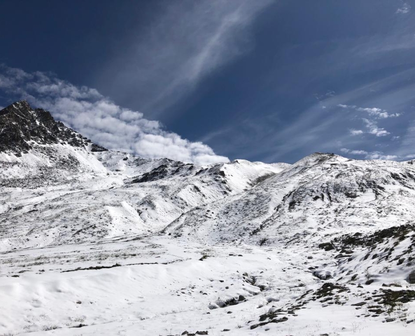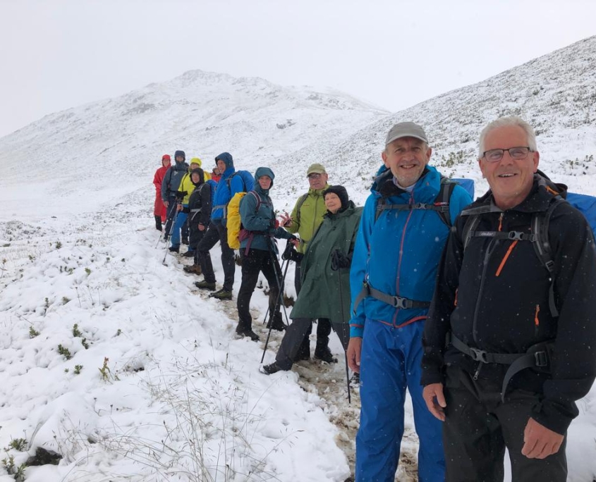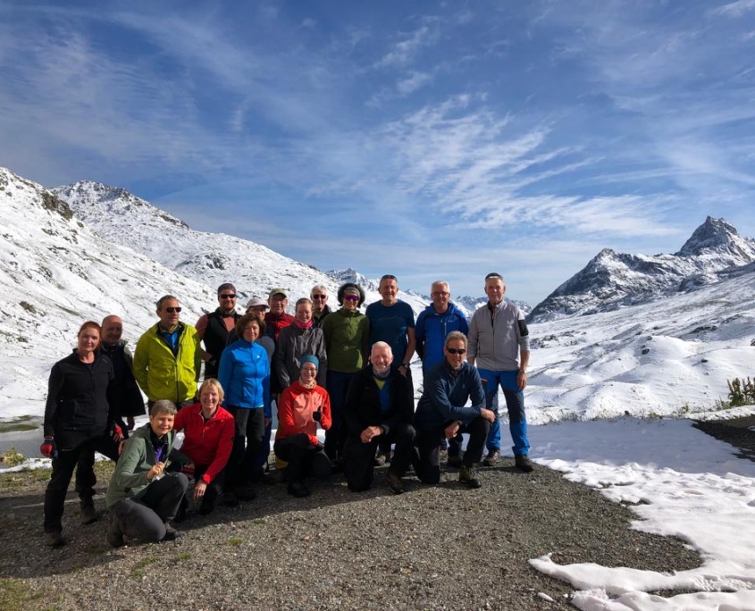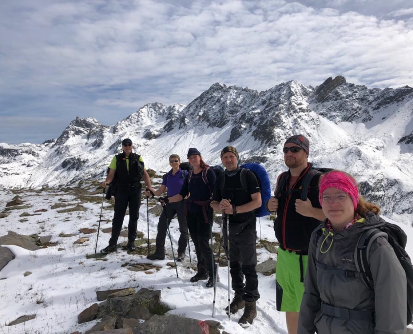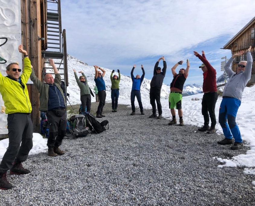 Dienstag: Beim Aufwachen wurden wir von strahlendem Sonnenschein und 5-6 cm Neuschnee auf der Außenbestuhlung begrüßt. Die nepalesischen Hüttenmitarbeiter waren fleißig dabei, die Terrasse mit Schneeschaufeln freizulegen. Was für ein Panorama! Frühgymnastik mit Nele auf 2320 m Höhe und die Aussicht auf einen Wandertag in gleißender Sonne durch eine weiße Wunderwelt – wir konnten unser Glück kaum fassen! Für diejenigen, die die Sonnenbrille zuhause vergessen hatten, gab es Fundbrillen von der Hütte. Von dem, was in den vergangenen Tagen alles auf dem Leib getragen worden war, verschwand vieles im Rucksack, und mach nackte Wade war zu sehen. Natürlich ließ die Sonne den Schnee im Laufe des Tages schmelzen und es wurde immer matschiger und rutschiger, so dass der Abstieg vom Muttenjoch (2620m) nicht ganz ohne war. Der Badesee neben der Friedrichshafener Hütte (2138m) sah verlockend aus, war es dann aber bei Temperaturen im einstelligen Bereich doch wieder nicht. Den letzten Hüttenabend verbrachten wir mit Gesang und Achims genialer Gitarren-Begleitung bis kurz vor der Bettruhe.