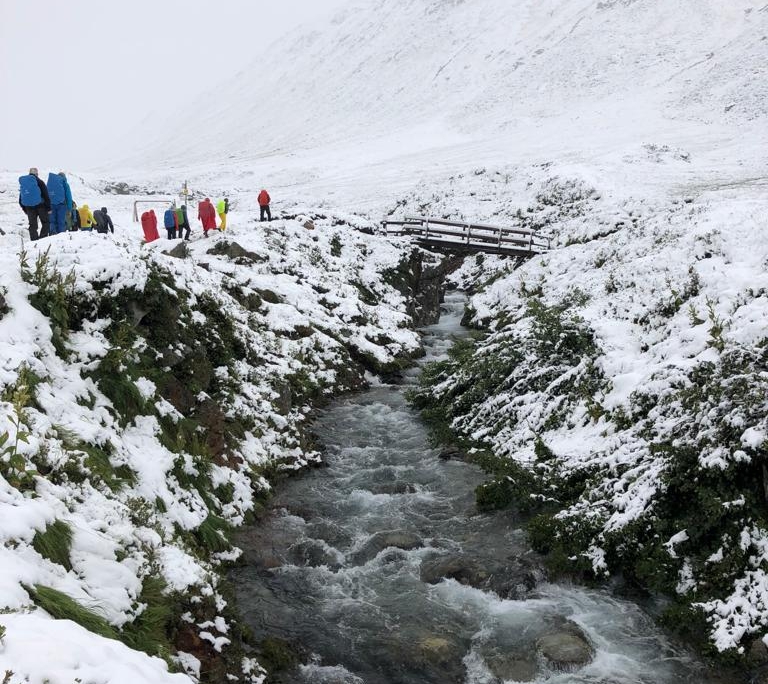 Montag: Am nächsten Morgen lag die Schneegrenze bei 1800m und wir starteten im Schneeregen. Bald waren wir in eine weiße Berglandschaft vorgedrungen und stapften durch teils fast kniehohen Neuschnee Richtung Heilbronner Hütte – ein völlig unerwartetes, aber besonderes Erlebnis. Auch die Kühe und Pferde auf den Weiden schienen erstaunt und drängten sich auf den Wegen. Für Gruppe B (die mit dem besonderen Anspruch: schneller, höher, weiter) vielleicht etwas enttäuschend, dass die B-Strecken angesichts der Wetterlage einfach zu gefährlich waren und alle die gleiche Strecke liefen, wenn auch in unterschiedlichem Tempo. Aber Sicherheit geht vor.