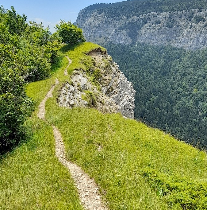 Unsere Sonntagstour startete vom Col de Granier. Über uralte Bergwälder ging es steil zum Mont Joigny 1556 m und zur La Pointe de la Gorgeat 1486 m hoch. Immer wieder boten sich weite Ausblicke in die tiefgrüne Chartreuse und zu den umliegenden Kalksteinwänden, die beeindruckendste lag mit dem Le Granier direkt gegenüber. Sogar seine Majestät, der Mont Blanc, grüßte aus der Ferne. Trotz Sonntag waren nur wenige Mitwanderer unterwegs, was während unserer Tage in der Chartreuse immer entspannend war. Bei Sonnenschein und 6- stündiger Wanderung wurde die Zunge immer trockener, dies ließ sich glücklicherweise auf der Terrasse des Restaurants am Col Granier beheben!